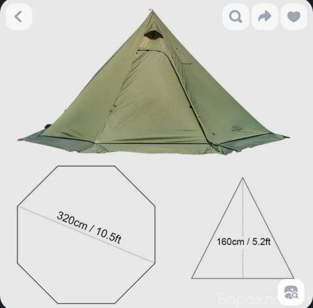 В комплекте оттяжки, разделка под трубу. состояние очень хорошее, есть несколько маленьких прожогов от искр, заклеены прозрачными заплатками. Водонепроницаемость: PU3000 мм Вес 1,7 кг